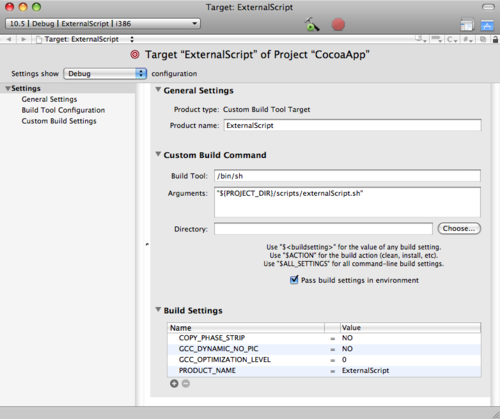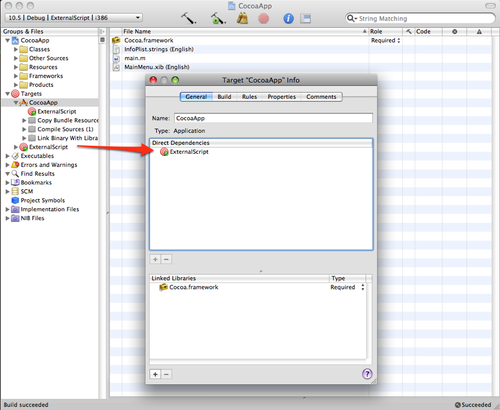 - Make this build phase a dependency of your main target. To do this, double-click on your main target in the “Groups & Files” section to get info on it, and go to the “General” tab. Drag your ExternalTarget into the “Direct Dependencies” list. This will make it get called every time you Build, or Clean (assuming you say “Also Clean Dependencies”) your main target.