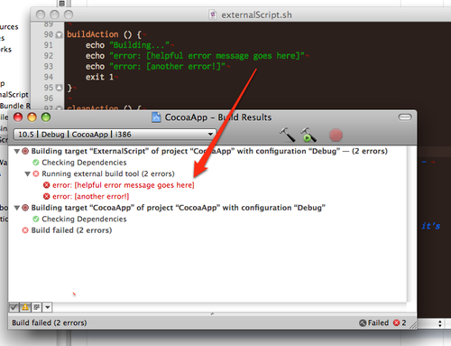 starts with “error: ”, Xcode will show that in the Build Results window, like
